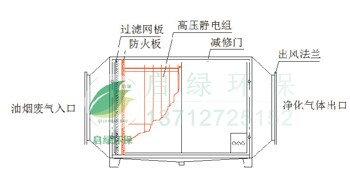 油煙由風機吸入靜電油煙淨化器,其中部分較大的油霧滴、油汙顆粒在均流板上由於機械碰撞、阻留而被捕集。當氣流進入高壓靜電場時,在高壓電場的作用下,油煙氣體電離,油霧荷電,大部分得以降解炭化;少部分微小油粒在吸附電場的電場力及氣流作用下向電場的正負極板運動被收集在極板上並在自身重力的作用下流到集油盤,經排油通道排出,餘下的微米級油霧被電場降解成二氧化碳和水,終排出潔淨空氣;同時在高壓發生器的作用下,電場內空氣產生臭氧,除去了煙氣中大部分的氣味。