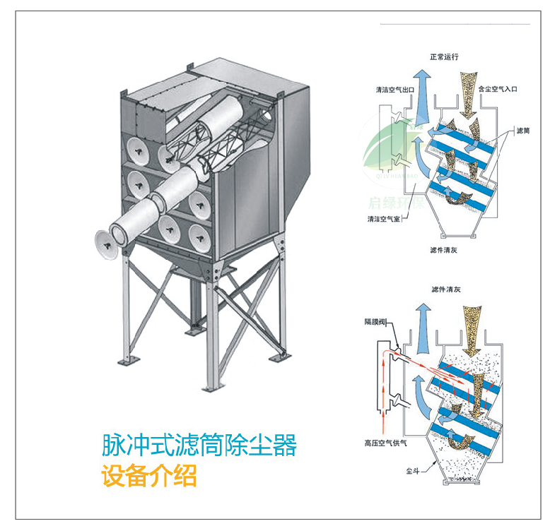 工業粉塵處理脈衝濾筒除塵設備具有體積小,效,投資省,易維護等優點,但因其設備容量小,難組合成大風量設備,過濾風速偏低,應用範圍窄,僅在糧食、焊接等行業應用。