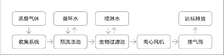 臭氣源點的臭氣經集氣係統負壓收集後,通過離心風機的抽送,被直接導入預洗滌—生物過濾池。前段具有有效除塵、調節臭氣的濕溫度、消減峰值濃度衝擊、去除部分水溶性物質功能。在後段的多級生物過濾床內,通過氣液、液固傳質由多種微生物將致臭物質降解。