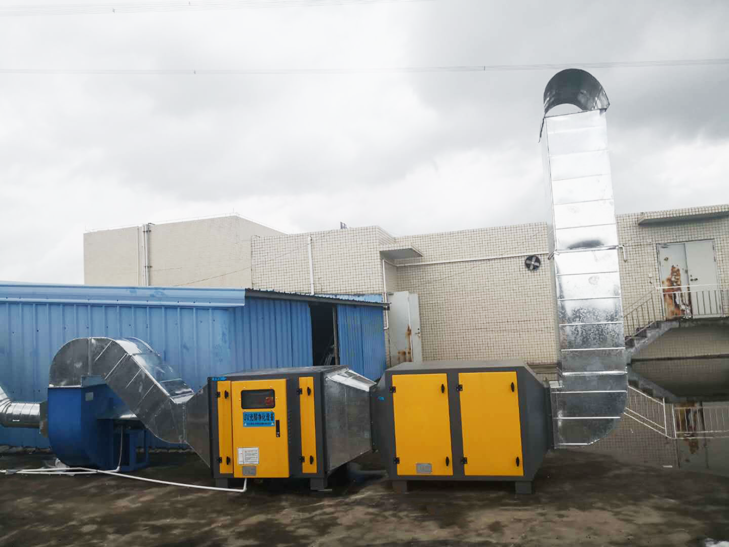 噴漆廢氣經過水簾櫃清洗後,對漆霧起到很好的清洗降解作用,由於漆霧呈粘稠狀,極易吸附在所接觸物上需定在清撈循環過濾沉澱漆渣,廢氣經氣旋噴淋塔進一步清洗處理後,廢氣中細小粉塵、未凝固的油漆顆粒及少量的有機廢氣被水噴淋吸收,確保廢氣中粉塵顆粒物大部份被攔截去除,進入UV光解處理設備,運用高能UV紫外線光束及臭氧對惡臭氣體進行協同分解氧化反應,使惡臭氣體物質其降解化成低分子化合物、水和二氧化碳。再進入活性炭吸附塔,有機氣體在床內被活性炭吸附,淨化氣體由加壓風機經排氣筒高空排放。